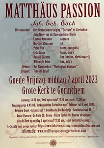 Op Goede vrijdag 7 april voert ’s middags het koor: Christelijke Oratorium Vereniging Gorkum de Matthaüs Passion van J.S. Bach uit. Een muzikaal meesterwerk waarin het lijdensverhaal van Jezus wordt verteld. U kunt kaarten bij mij bestellen en die kosten €45,-.